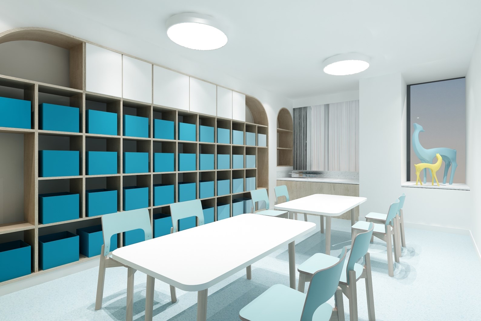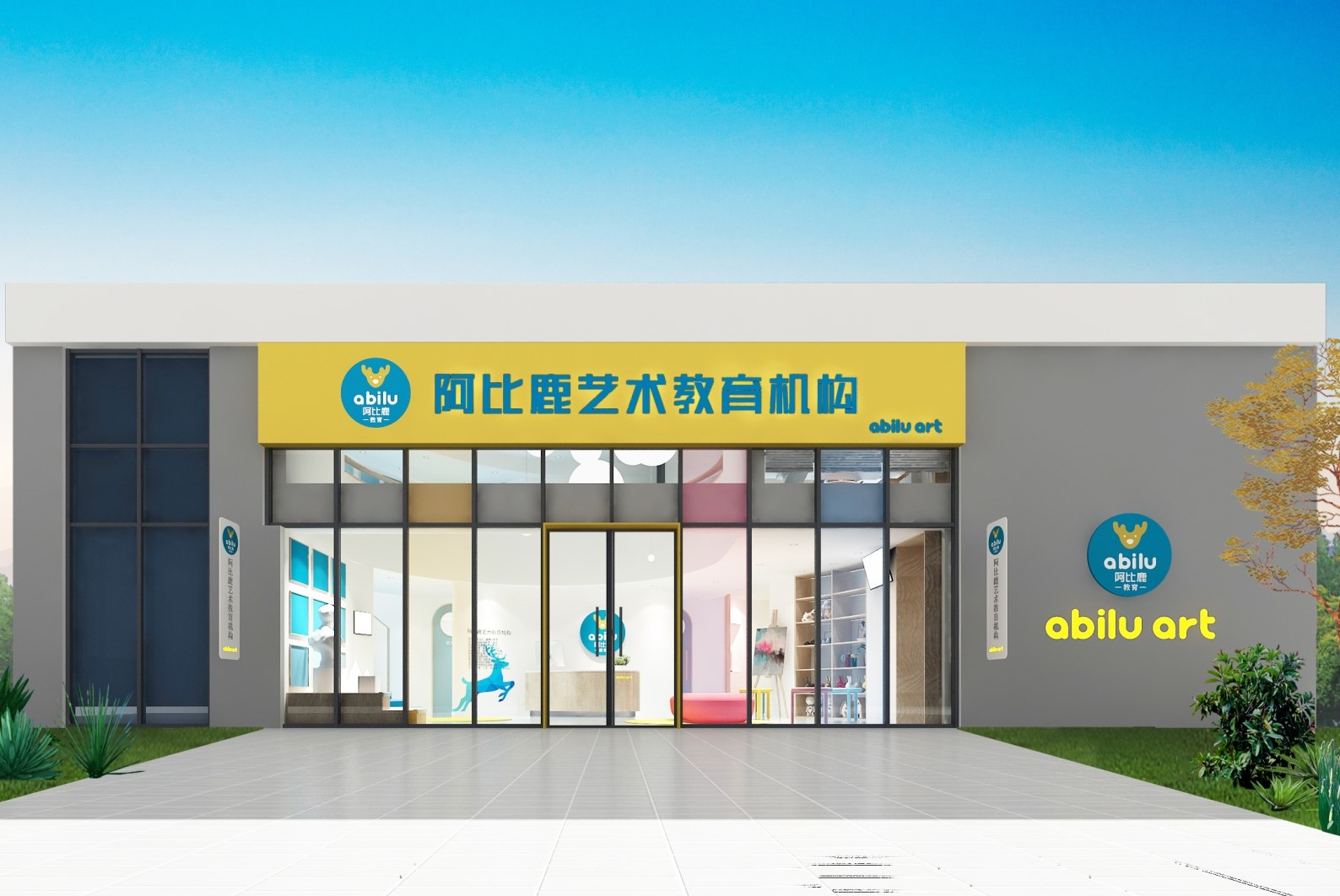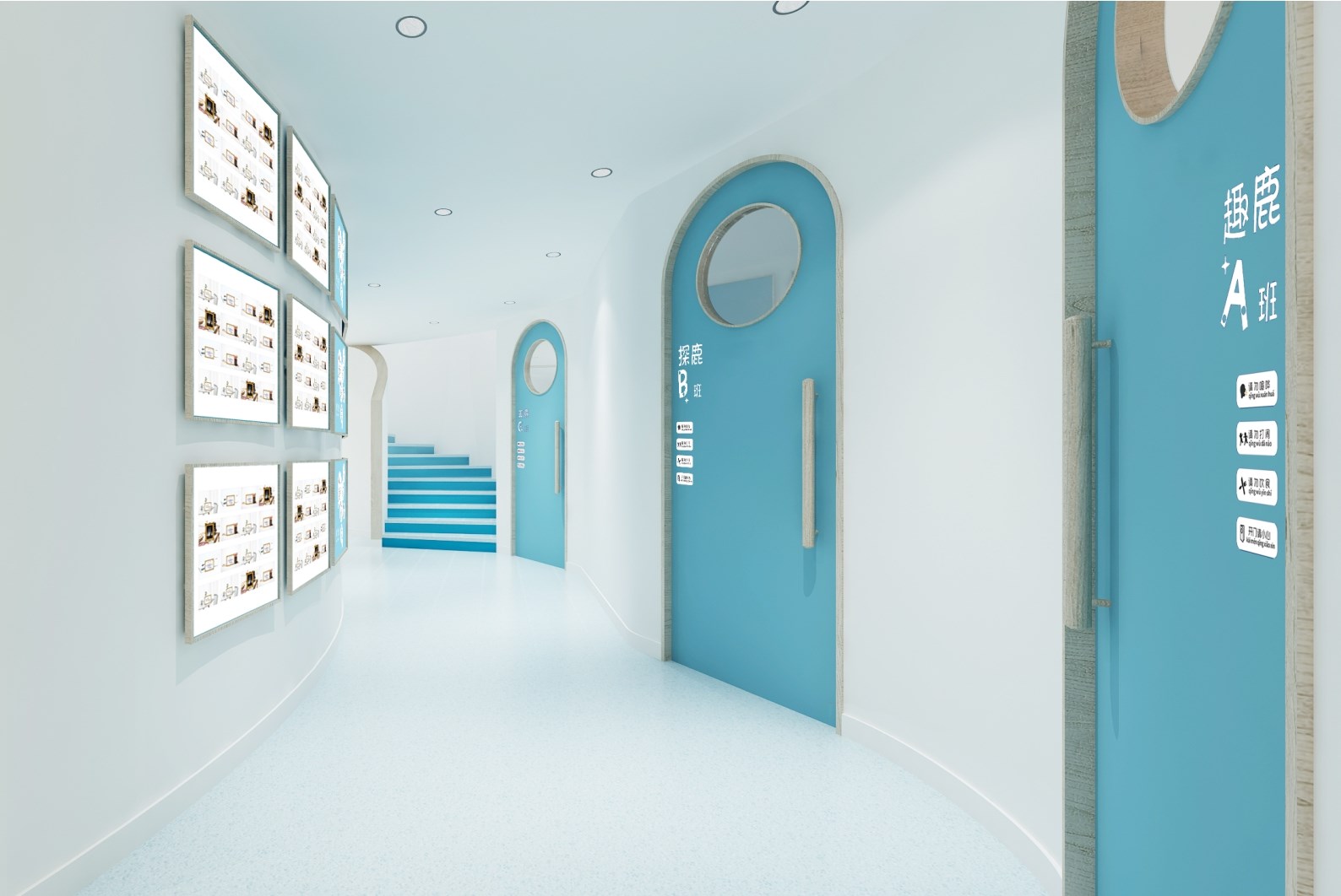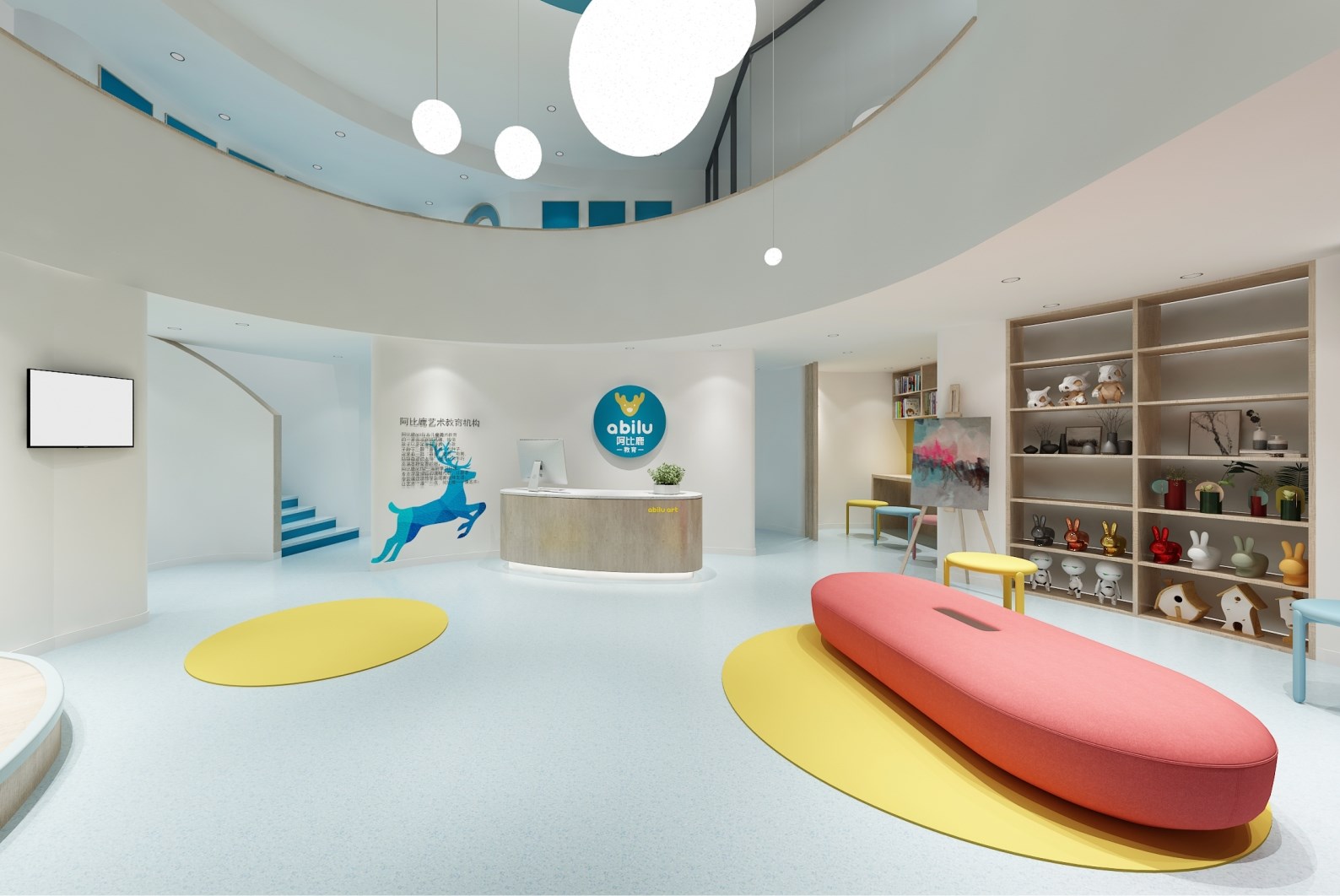 该学校位于独栋写字楼一层整层,南侧北侧基本为整面玻璃幕墙,四周花园绿植环绕,通过设计打造为美式馆的感觉,整体具有简洁艺术,并设置作品展示区的一所关于0至8岁的儿童美术培训学校。