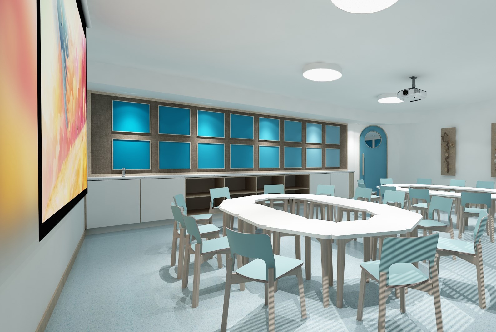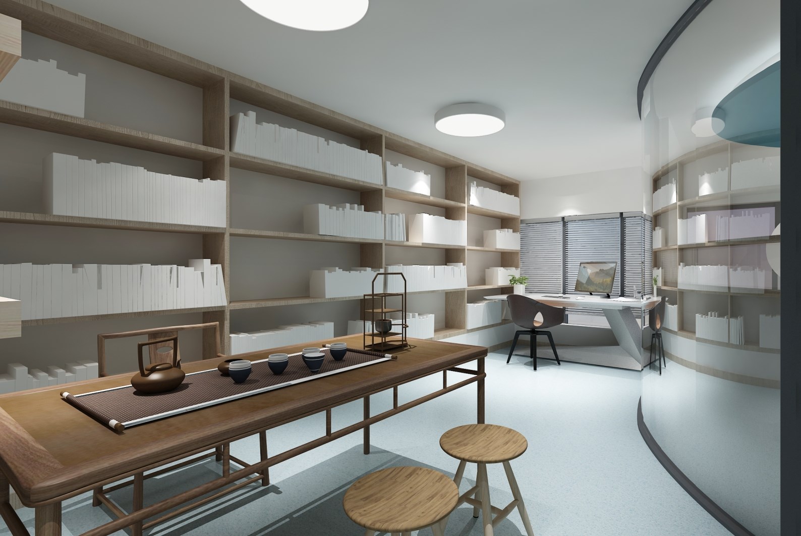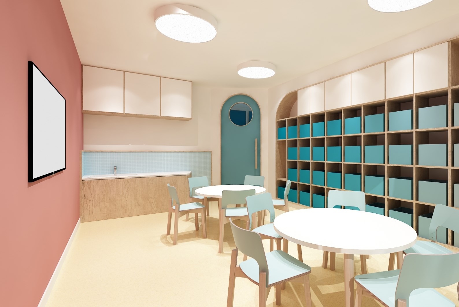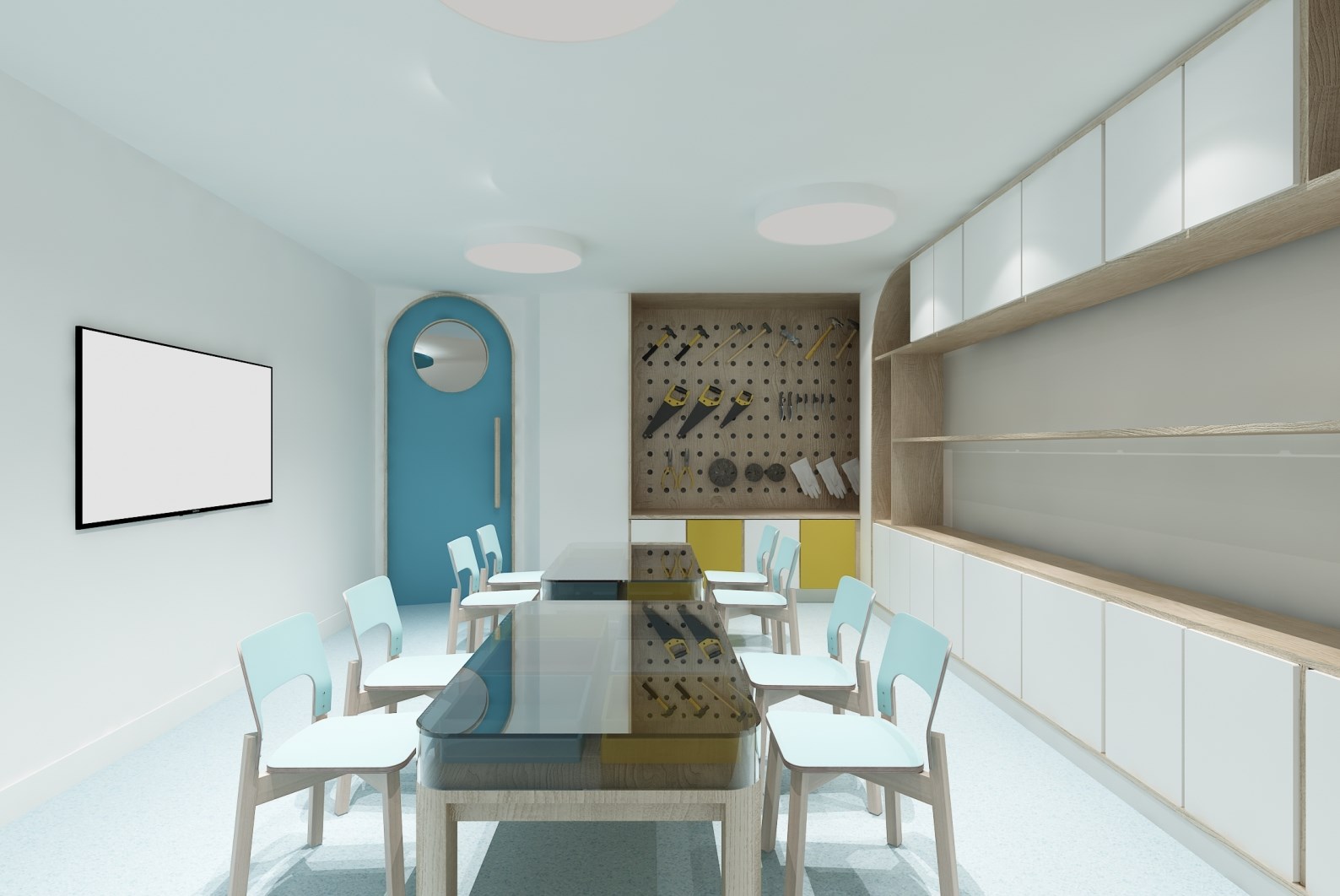 该学校位于独栋写字楼一层整层,南侧北侧基本为整面玻璃幕墙,四周花园绿植环绕,通过设计打造为美式馆的感觉,整体具有简洁艺术,并设置作品展示区的一所关于0至8岁的儿童美术培训学校。