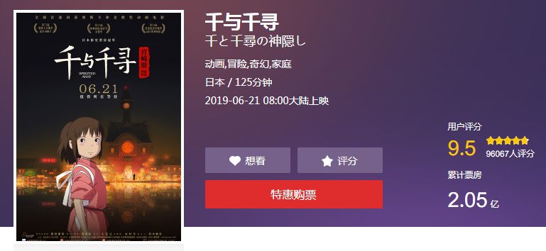本周五《千与千寻》在国内公映,截止发稿上映四天,票房正式破2亿!