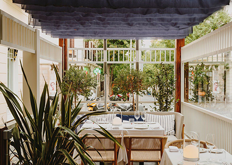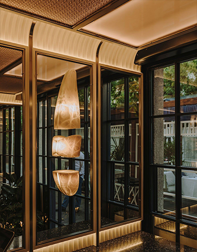 设计师们的概念方法在餐厅的餐厅露台上得到体现,在那里,一个木质结构支撑着深蓝色半透明织物,当它悬浮在桌子上方时,给人一种海浪的感觉。该空间被自然色彩和木质纹理的调色盘所包围,被定制的船形顶灯所主导,进一步强化了海景主题。