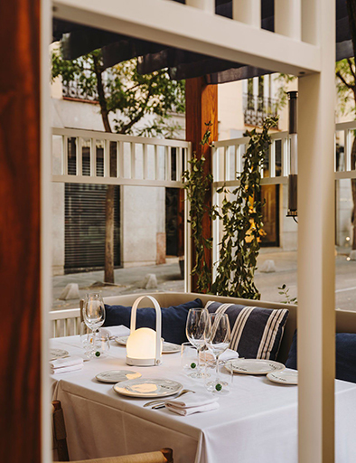 在底层,主用餐区被设计成两个截然不同但又相互补充的区域,一个唤起了马拉加鱼市的凉爽魅力,另一个唤起了传统造船厂的工艺。前一个空间以蓝色和白色色调的圆形吧台为中心,由花岗岩、水磨石和拉丝钢等凉爽材料构成,并与核桃镶板、白色木质天花板横梁和模仿渔网的白色编织织物交织在一起,呈现出更加柔和的纹理:晚上,彩色霓虹灯从背后照亮编织织物面板,将高档鱼市氛围换成休闲氛围。