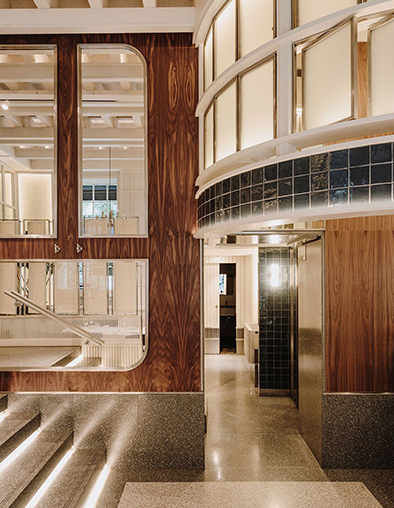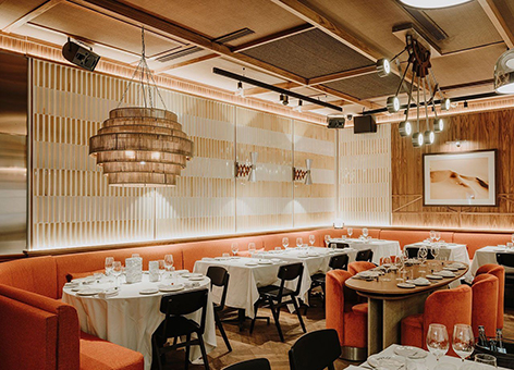 在毗邻的造船厂启发的空间,一个温暖的调色板核桃木,温暖的白色和陶土织物占主导地位,增强了定制的陶瓷墙砖交替米色和奶油色,其闪闪发光的模式暗示鱼鳞。复古海景画与当代鱼形雕塑并置,而不锈钢墙面巧妙地将两个区域连接起来。