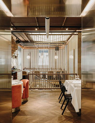 第二个私人用餐空间也有一个燕子桶拱顶,尽管是用深蓝色而不是红色绘制的,它与闪亮的蓝色墙砖、海胆状的烛台和沙墙一起,唤起了深海中的一种不可思议的场景,而不锈钢吧台、镜子和皮革装饰为用餐体验增添了整体的丰富性。