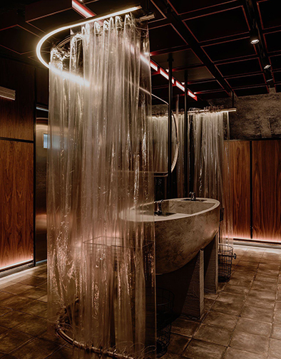 一个宏伟、光线充足的楼梯将顾客引向地下室,从地板到天花板都有航海绳索,一面用马拉加海滩的材料制成的沉浸式沙墙将航海主题带到了前台,而楼梯底部的一个圆拱形大厅,用红色瓷砖和一幅黑色背景的鱼的巨画装饰,营造了一种更加亲密的氛围。