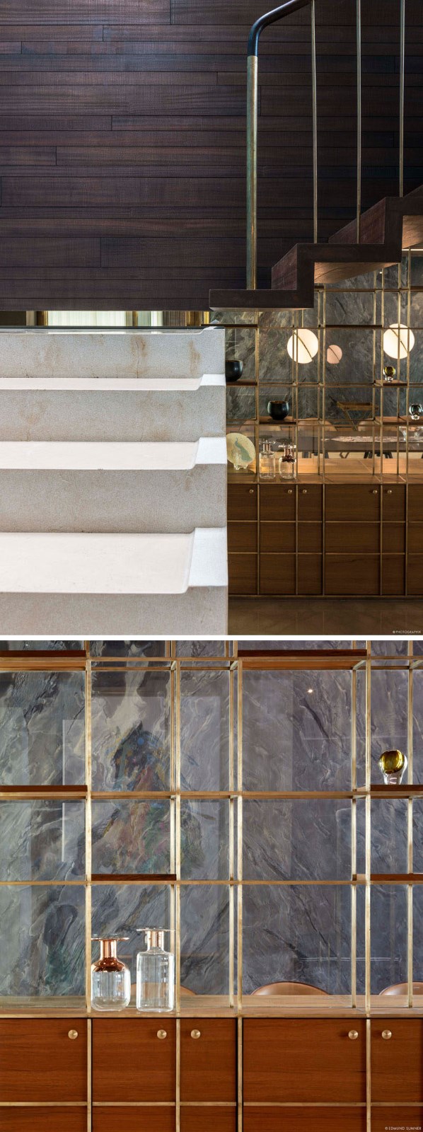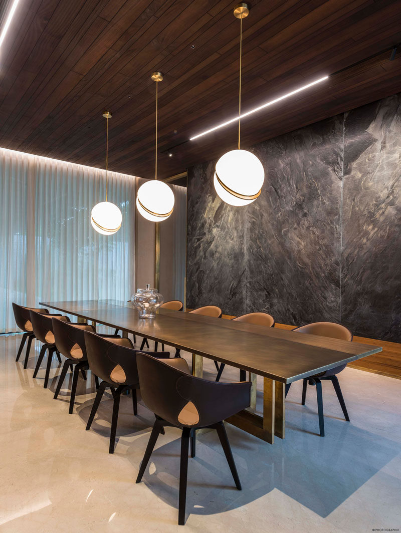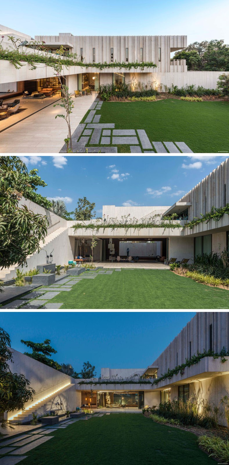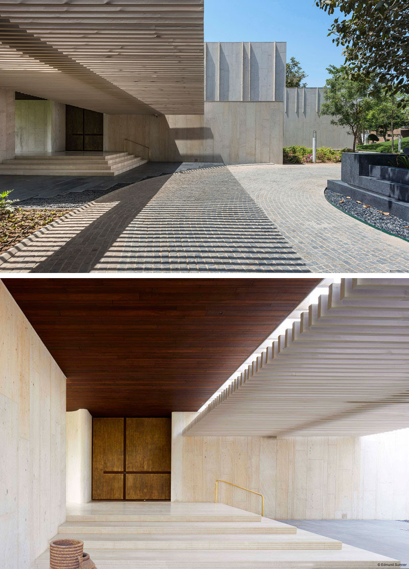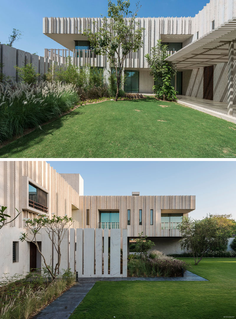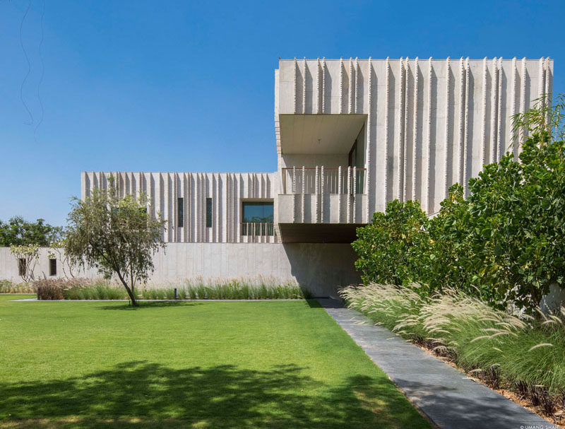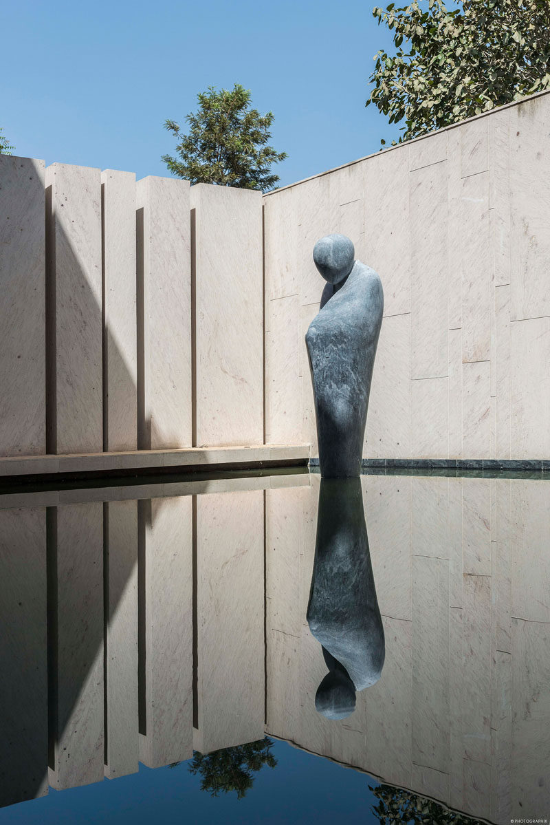 SPASM设计公司最近在印度艾哈迈达巴德完成了一座新的现代住宅,其外观采用了Dhrangadhra石材,并采用了简单的交叉布局。前门的一侧是一个池塘水景,里面有一个简单的儿童造型的折叠帆船雕塑。走进前门,就会看到另一处水景,有一尊与真人大小的贝斯拉那石雕成的沉思的僧侣雕像,小心翼翼地悬在水面上,仿佛悬浮在空中。由于房子的十字形,有多个庭院,促进空气在整个住宅的流动。景观花园有坚固的石阶,通往花园的高架屋顶。粗糙切割的石鳍垂直于建筑立面,创造了整天变化的阴影。在室内,住宅的起居区域有大的滑动玻璃墙,可以打开来创造室内/室外的生活环境。在餐厅里,三盏吊灯悬挂在一张大餐桌的上方,而石板则挂在墙上。在整个住宅中,丰富的深色木材与粉刷过的石灰灰泥墙搭配在一起,形成了类似灰泥的外观。鲜艳的色彩,比如楼梯旁边的蓝色重点墙,为室内增添了一丝光亮。隐藏在另一组楼梯下的是一个小酒吧区,里面有开放式的架子和储物柜。这块石头来自附近的采石场,纹理斑驳,呈骨色,年代久远。这种砂岩的多孔结构保持间歇性的微小空气间隙,作为一个绝缘板本身。