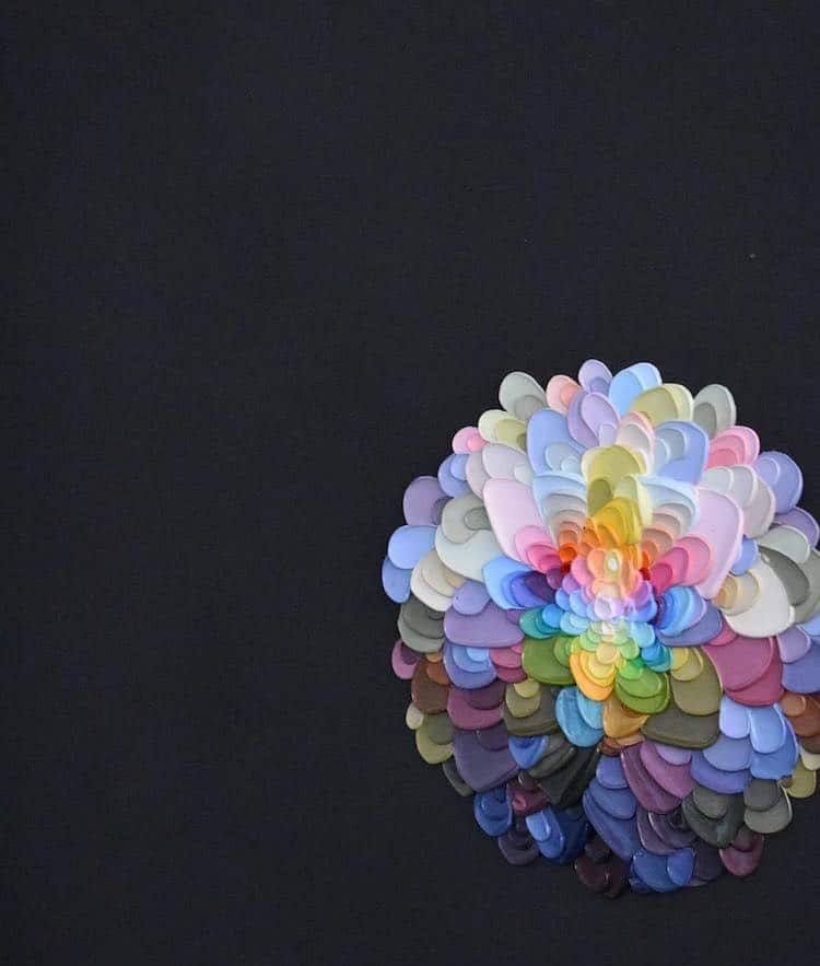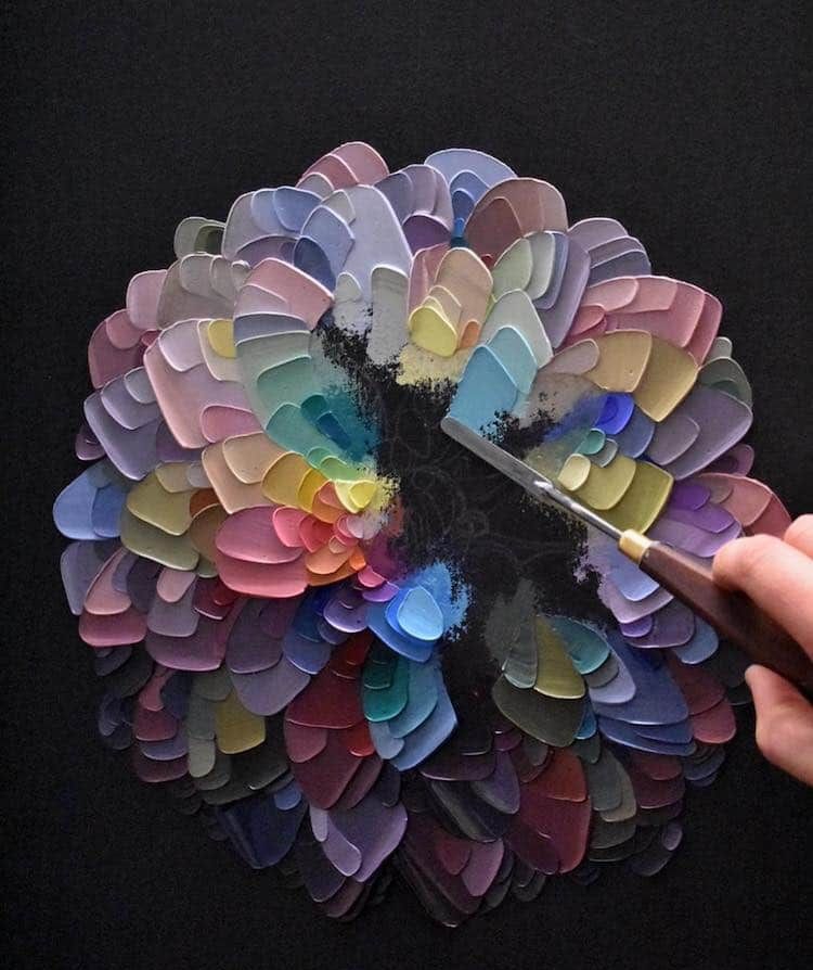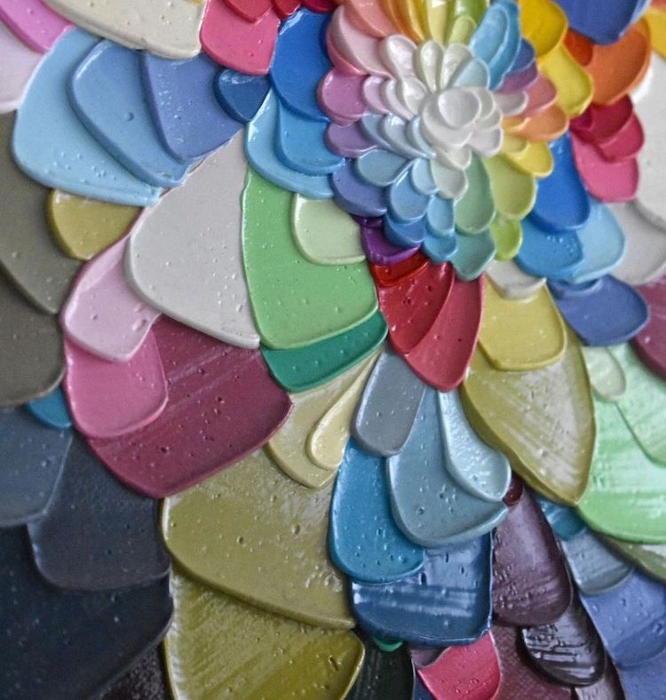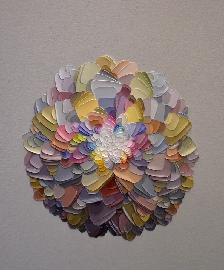 新西兰艺术家约书亚·戴维森创作了令人着迷的调色板刀画。这些引人注目的浮雕是由几十个单独制作的花瓣组成,这些花瓣带有颜色。虽然这个系列起源于这位23岁的画家实践色彩理论的一种方式,但后来演变成了对称、饱和和对比的研究。