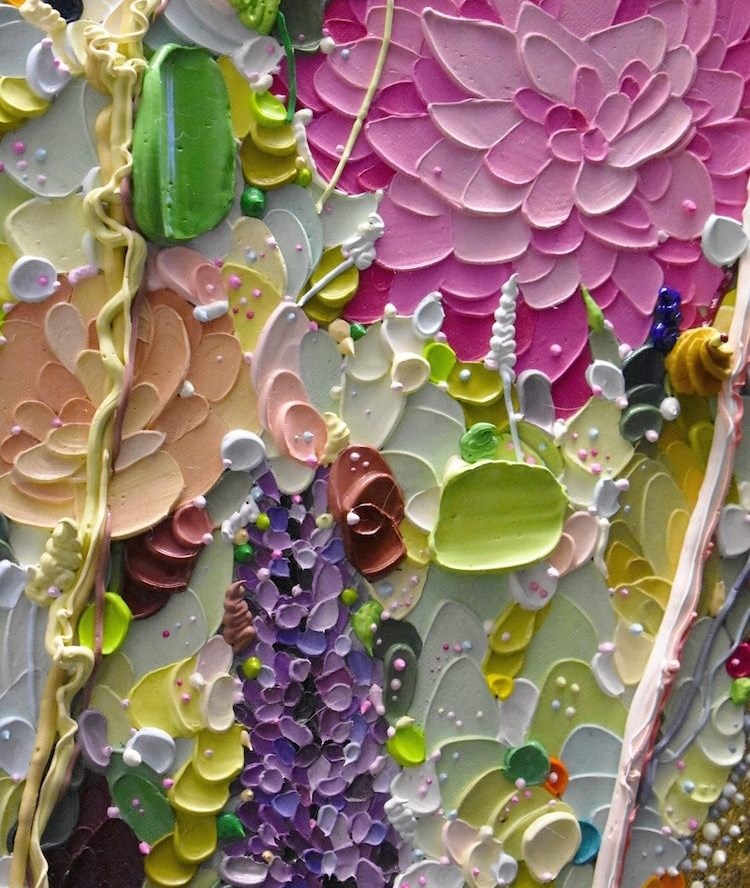 每个花瓣是由一个单一的调色板刀和油画和丙烯酸涂料组合而成。